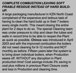 The product has a proven record of assisting the boiler operators in achieving far higher boiler efficiencies and reducing the cost such as coal savings, less need to strip and clean the boilers due to cleaner combustions process, and finally substantially reducing gas emissions through the smokestack.