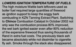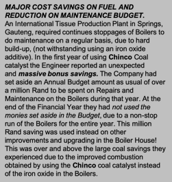 • Black sooty smoke and particulate emissions will also be virtually eliminated with the use of the CHINCO Catalyst due to the lower ignition temperature combusting the flammable soot and other particulates in the boiler gasses.